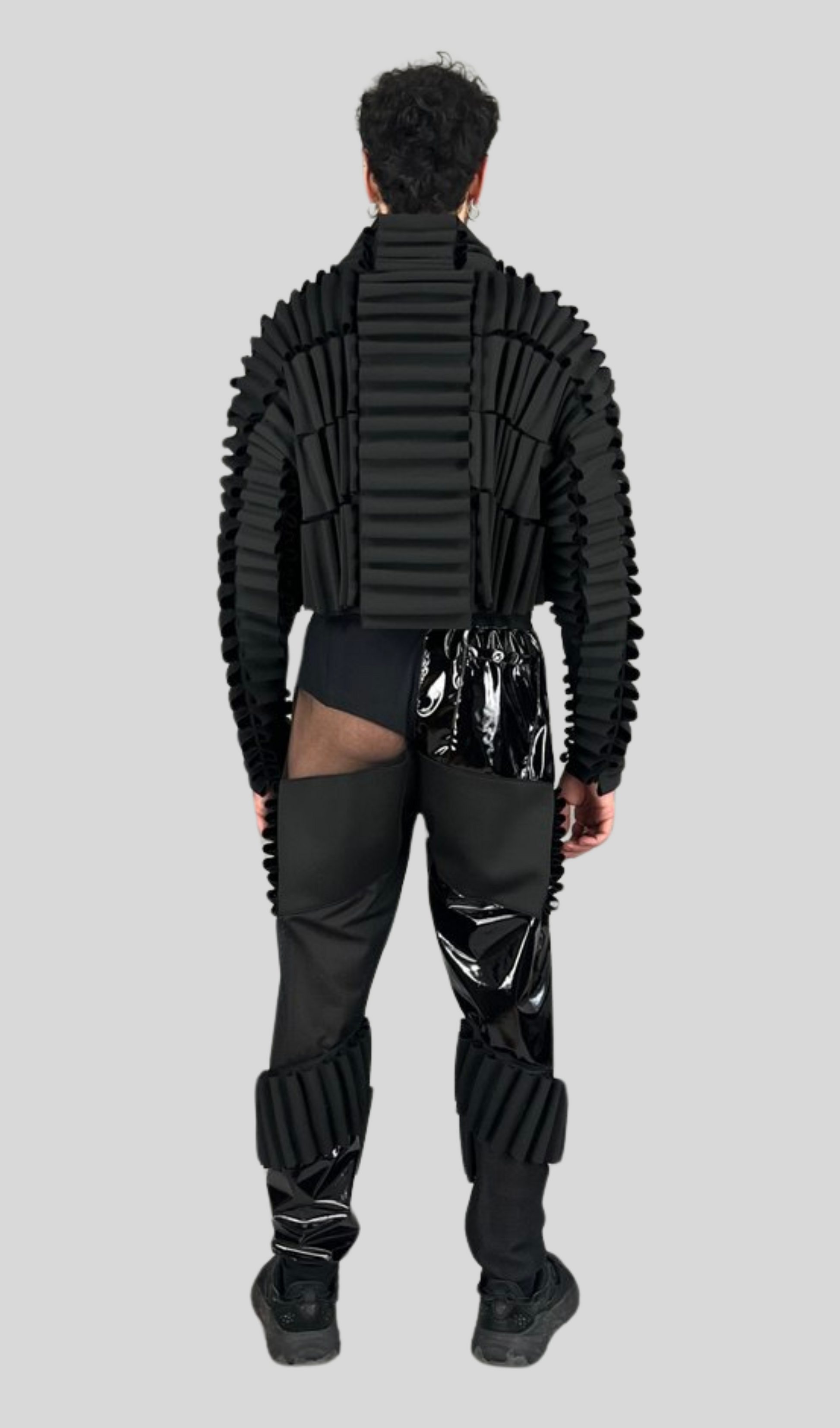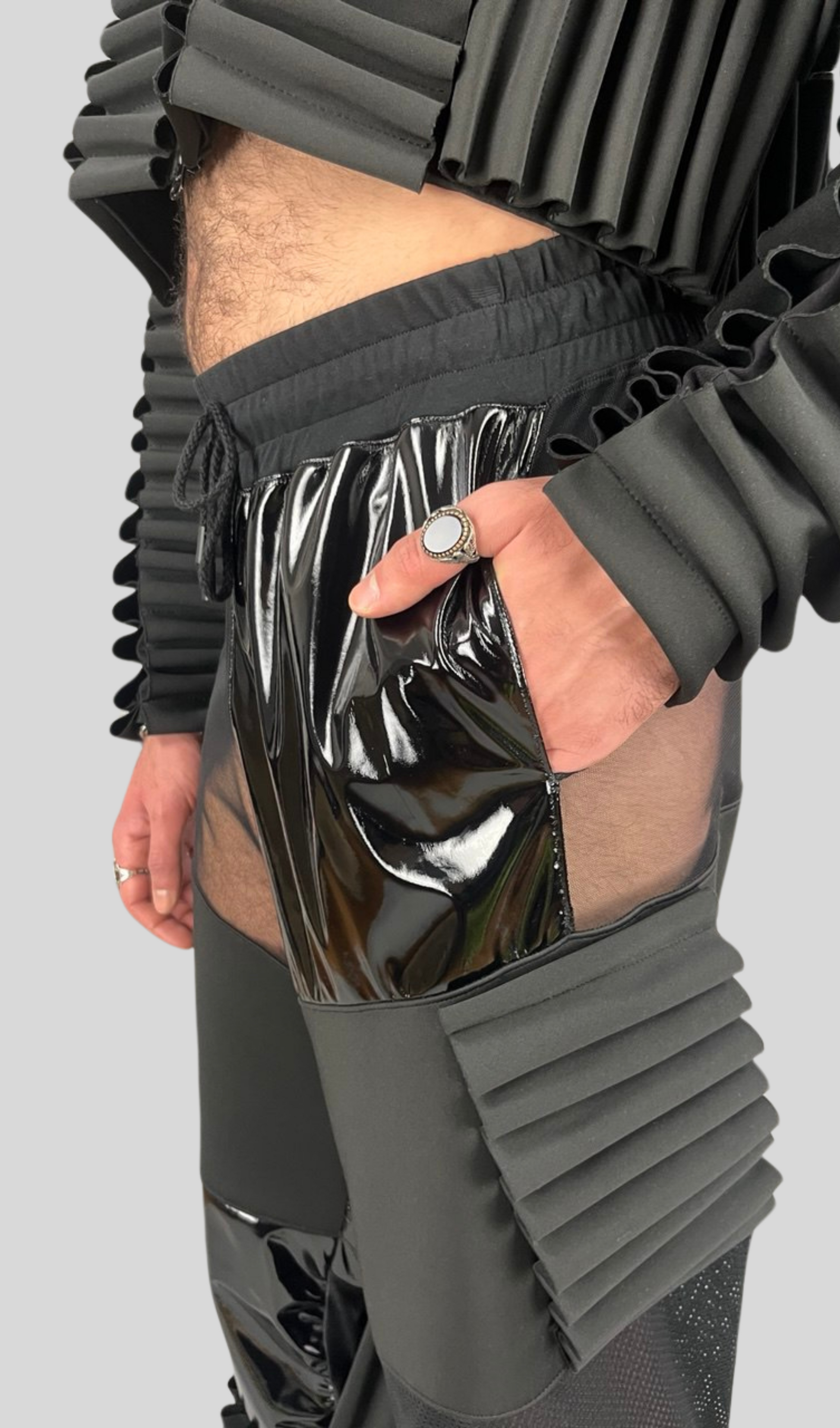 Jacket has no pockets. Pants has one pocket. Made from various material, jacket from stretchy thicker cotton and scuba like polyester material pants mostly Pe/Pu fabrics