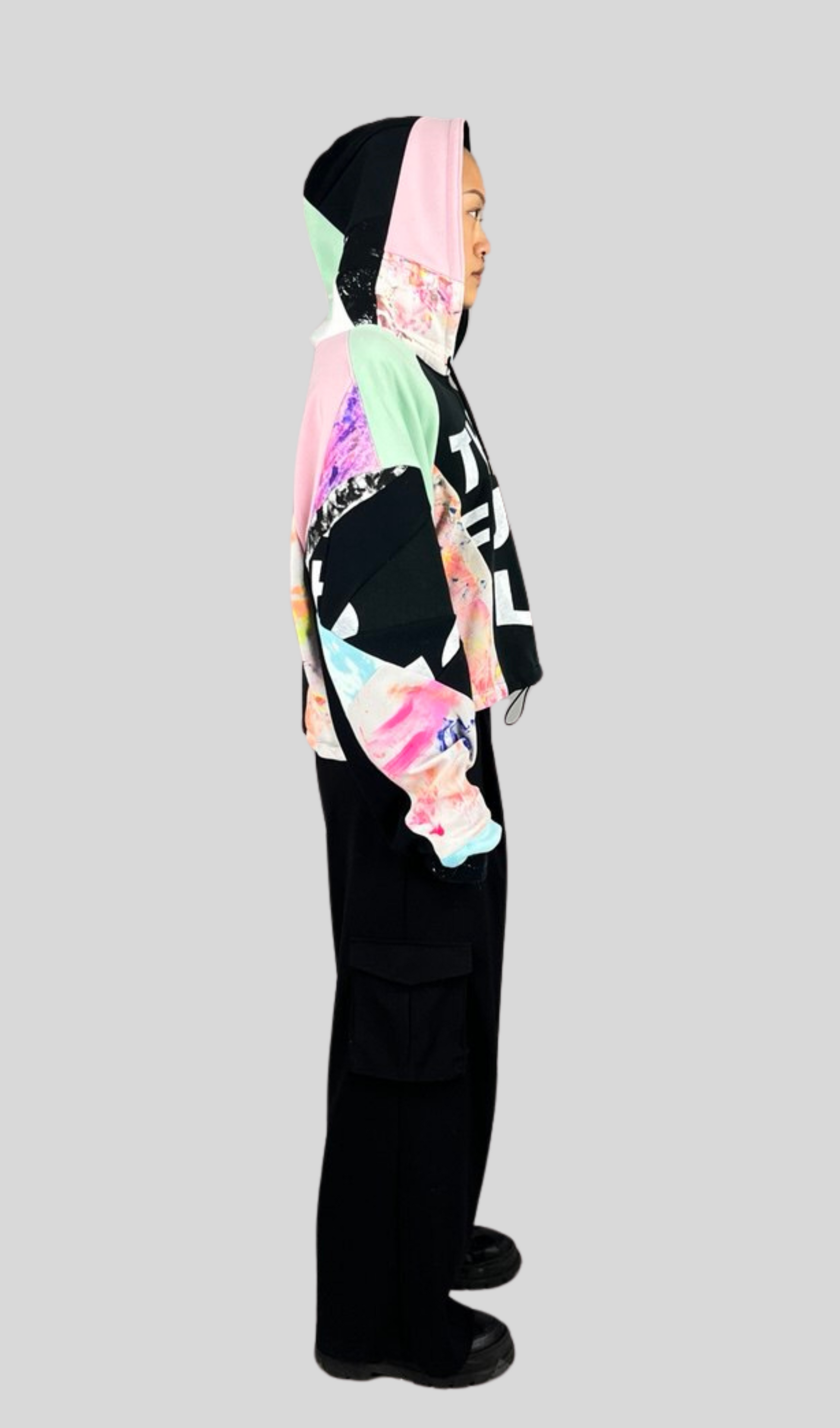 Unique combo of painted, printed and bleached fabrics in pastel and black and white colors what makes it a true signature item that´s gonna be worn non-stop, I swear. Mostly made from upcycled cotton jersey clothes, all carefully collected and assembled. Reworked fabrics can contain characteristic traces of a former life, like small stains or holes.