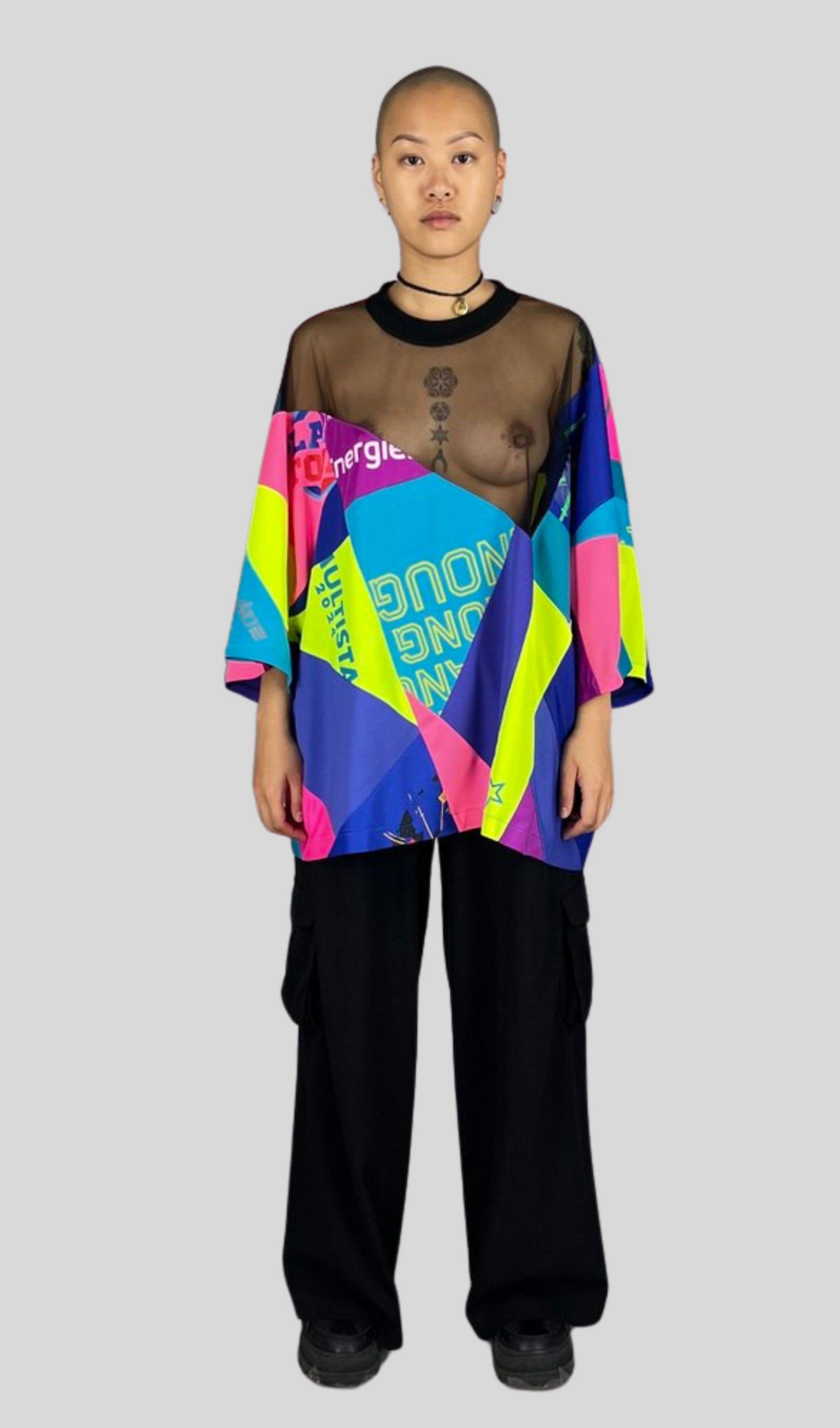For clubs, for festivals, for first to fifth dates, for the shy and for the 7% of extraverted folks out there, this one´s for you. One of a kind and assembled of the most colorful sports shirts, light, breathable, a bit of showy and a lot of fun. Perfect to layer on a long black dress, big pants, no pants and chunky boots. Mainly made of polyester shirts and polyester mesh, soft cotton viscose collar. Reworked fabrics can contain characteristic traces of a former life, like small stains or holes.